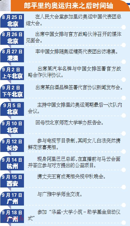 从里约回国后,郎平这位全民女神很忙。从记者整理的时间轴可以发现,从8月24日开始,她辗转于各大城市,参加代表团总结大会、随奥运精英访问,出席赞 助商庆功活动、签约代言产品、参与进校园公益活动、亮相大型综艺节目……几乎每隔一两天,郎平就在一个公开场合露面,而她所到之处,无不引起万人空巷。