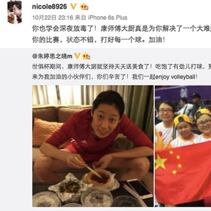 除了在比赛场上有号召力,结束比赛后,朱婷“深夜防毒”的搞笑行为也引起网友的关注。在土耳其联赛为朱婷负责饮食的康师傅聘请的厨师赛前给朱婷送上营养大餐,这个自称“吃货”的姑娘不忘发微博展示一下:“世俱杯期间,大厨坚持天天送美食!吃饱了有劲儿打球,努力打好每一个球!远道来为我加油的小伙伴们,你们辛苦了!我们一起enjoy volleyball!”