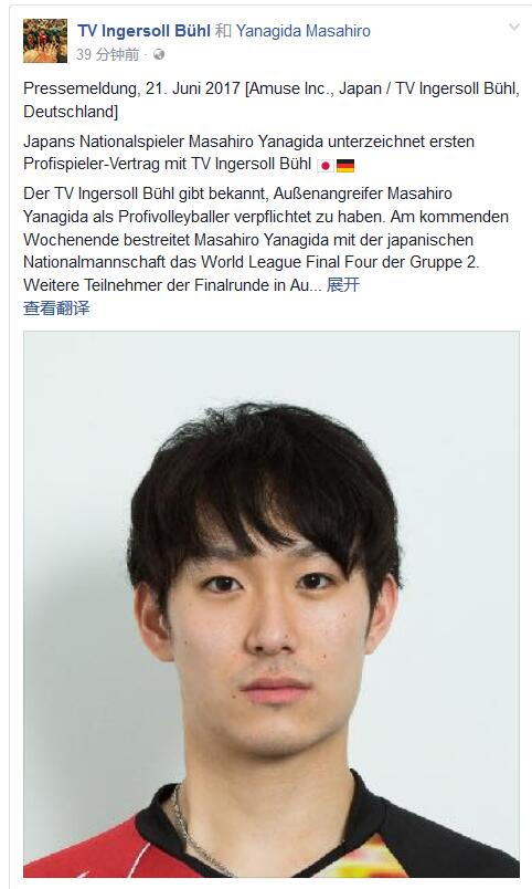 北京时间6月21日消息,被日本排球界称为“排球王子”的日本男排国手柳田将洋下赛季将加盟德甲布尔英格索兰体协(TV Ingersoll Bühl)男排俱乐部,开启自己的留洋生涯。