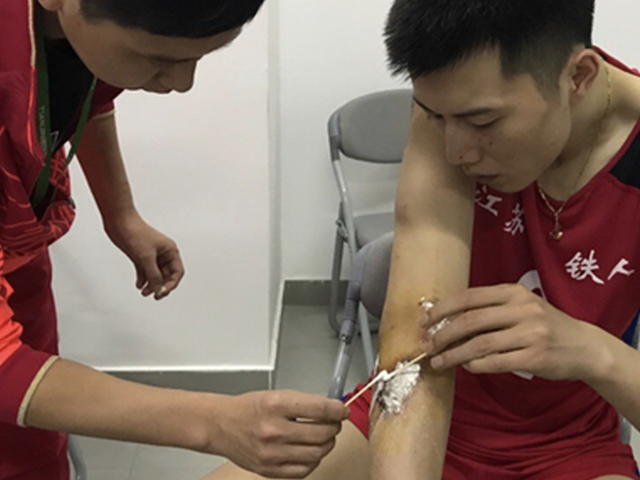 在处理肩部的擦伤时,张晨的伤口似乎有些脓肿。队医表示:“一打比赛,肩部这里的伤口会裂开。”