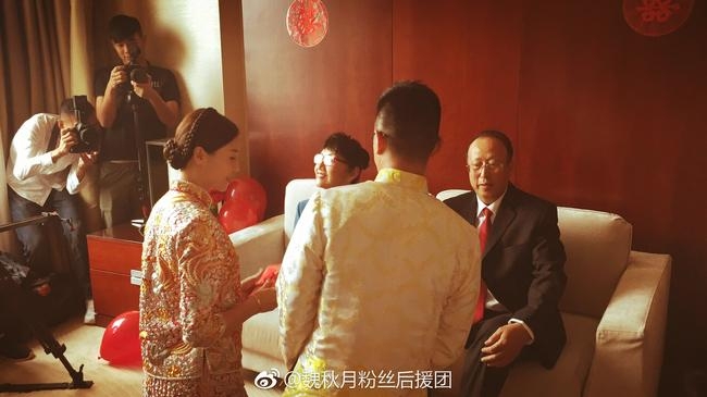 今天的婚礼,魏秋月还安排了手机网络直播。由于酒店信号不太好,直播不太顺畅,但气氛非常好。网友们也纷纷送上美好祝福。魏秋月还面对镜头与网友互动:“大家觉得我今天美吗?”“美!”