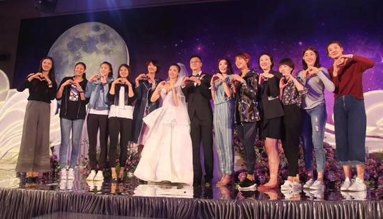 婚礼礼成后的拍照环节,新老国手及天津女排队员纷纷上台和新人合影。