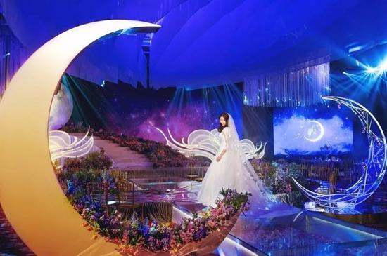 现场有各种月亮的造型,T台两侧的三轮半月,寓意为魏秋月的三届奥运会,走过T台走上舞台, 主背景是一轮圆月,代表了一对排球人的完美爱情,也象征着朝着大大的幸福出发。