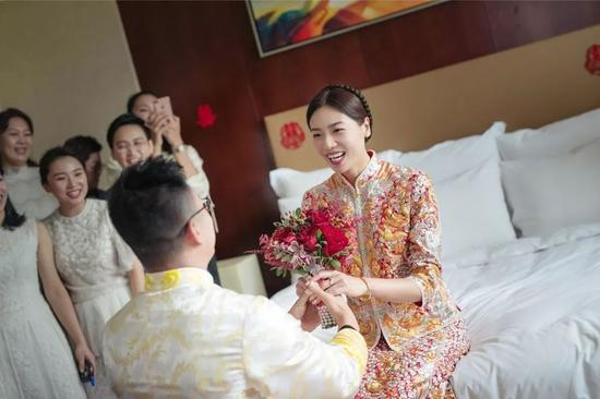 按照天津的习俗,婚礼这天上午是迎亲环节,前女排国手张娜、张磊、楚金玲等作为压阵姐妹团,一直守在魏秋月身边严密“保护”着她。10点45分,袁灵犀手捧鲜花,带着伴郎团来到月月的房间,姐妹团拿出了一大沓微信二维码,新郎必须要扫码回答对问题,经过新娘检验才算过关。