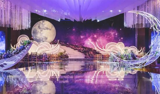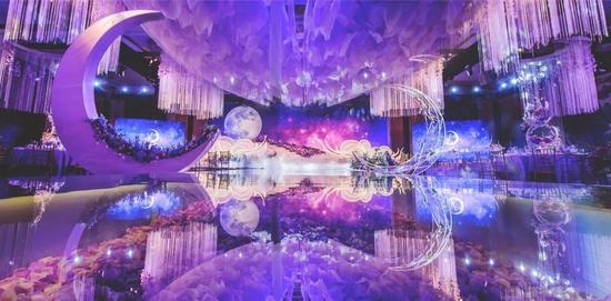 整个色调选用紫色,这是魏秋月喜欢的颜色。据说设计者的灵感来自魏秋月曾经转发过一条微博———“假如世界都变成紫色”,而婚礼的主题“月灵犀”,灵感则来自《城里的月光》中的一句:“心若知道灵犀的方向”……