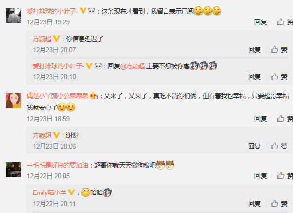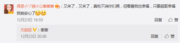 图中米杨正与方颖超视频聊天,幸福洋溢在二人脸上,这一微博更是引无数朋友球迷祝福,“米小姐和我家方哥,米小姐别欺负方哥,虽然我是娘家人,但是我向着方哥!”、“又来了,又来了,真吃不消你们俩,但看着我也幸福,只要超哥幸福我就安心了”、“超哥你就天天撒狗粮吧”、“请考虑我们单身狗的感受,越来越会秀恩爱了哟”、“哎呦喂~超超~”,方颖超和米杨也在评论中和网友互动,更加证实了两人在一起的传闻。