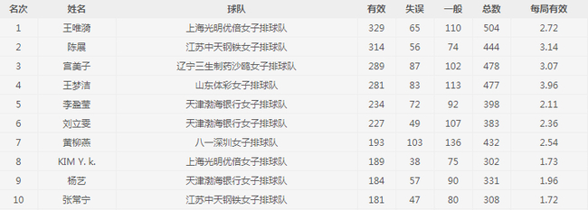 传球榜单中天津女排姚迪以18.65个每局有效占据榜首,上海女排米杨15.23排名第二,辽宁女排丁霞13.44位列第三。