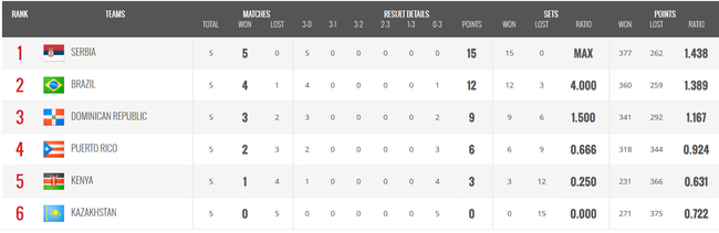 D组:塞尔维亚、巴西、多米尼加、波多黎各出线