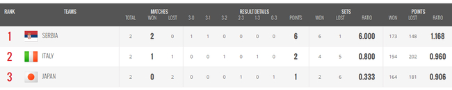 G组:塞尔维亚和意大利小组前两名,日本出局