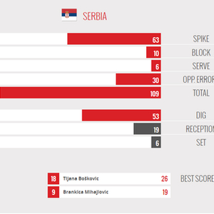 塞尔维亚的接应博斯科维奇26分,米哈伊洛维奇19分,维利科维奇和拉西奇同获10分,奥杰年诺维奇8分,布萨6分。意大利女排接应埃格努33分,波塞蒂14分,塞拉10分,达内西9分,齐里切拉3分,马利诺夫2分。