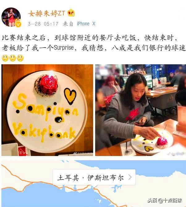 另 外,在土耳其,朱婷更是名副其实的万人迷,还记得3月份时候,朱婷在微博上分享了一个趣事:她在比赛结束后随意在球馆附近找了家餐厅吃饭,结果当她快吃完 后,老板突然送给她了一个大惊喜,一份甜品蛋糕,上面写着“伊斯坦布尔,瓦基弗银行”,旁边还用一朵花和一颗心做点缀,这让远在他乡的朱婷备受感动!