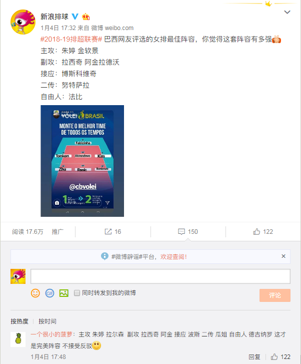 北京时间1月5日消息,巴西球迷在社交网站评选当今女排最强阵容,在这份榜单上中国女排队长朱婷入围。此外在其他球迷评选的最佳阵容中,朱婷皆榜上有名,由此可以看出中国女排队长朱婷毫无争议为当今女子排坛第一人。