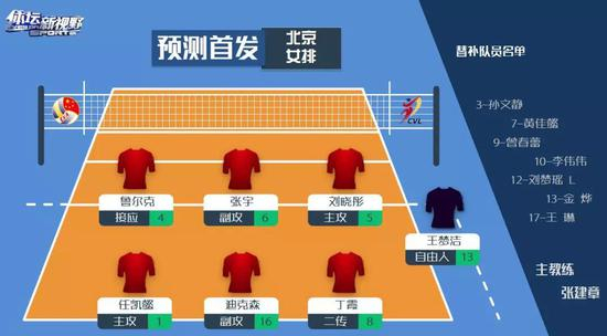 北京女排对首发阵容进行了一个位置的调整,任凯懿首发,与刘晓彤打对角。比赛中,北京女排的人员调整集中在主攻位置上,刘晓彤、曾春蕾、任凯懿、金烨,四个人轮番上阵,甚至连原本打自由人位置的王琳也为了加强一传打到了主攻位置。孙文静和李伟伟都曾短暂出场。