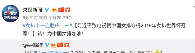 习近平致电祝贺中国女排夺得2019年女排世界杯冠军。