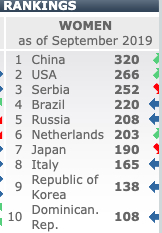 美国队夺得今年世界杯亚军进账90分,2017年大奖赛第5名获得84分,2016年里约奥运会铜牌积80分,2018年世锦赛列第5得到58分,总分为266分,也成功超越了塞尔维亚,从上一期的第3升至本期的榜眼。
