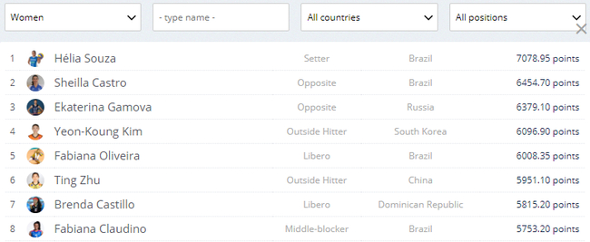 据悉volleybox世界女子排坛运动员排名,根据球员代表国家队或俱乐部参赛的成绩以及在赛事中个人奖项两个部分组成。每一项赛事都会有不同的等级,并且在一项赛事中的名次也会有不同的得分。