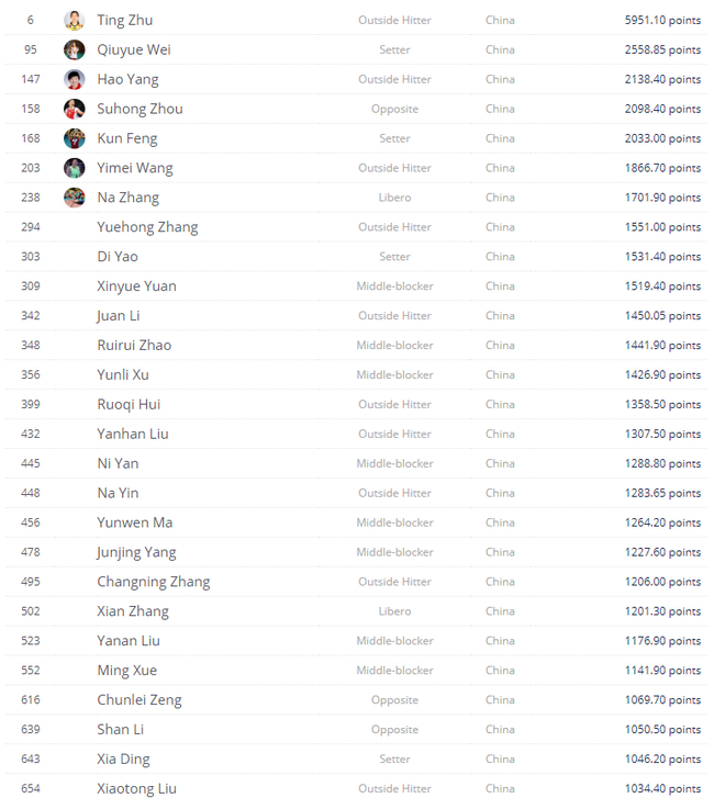 朱婷是中国女排唯一一位闯入历史前十的中国球员,中国女排前主力二传魏秋月排名第95,朱婷和魏秋月也是目前唯二闯入前100的中国选手。此外,中国女排黄金一代杨昊第147、周苏红第158、冯坤第168、王一梅第203、张娜第238、袁心玥第309、张常宁第495。