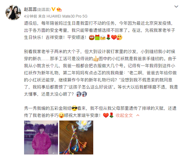 北京时间6月25日,一年一度的传统节日端午节,雅典奥运会冠军、中国女排队员赵蕊蕊在微博表到了对家人的思念。