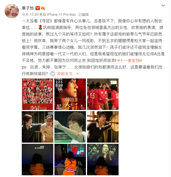 巩俐姐演郎指导,两位各自领域里最杰出的女性,欣赏她的表演,感受她的故事,熬过九个月的等待又如何?所有属于这部戏的筋骨与气节早已跃然纸上!很庆幸,我带了两个女儿一同观影,不到五岁的醒醒愣是和大家一起坚持看完字幕。三场赛事惊心动魄,我几次潸然泪下!孩子们或许还不能完全理解女排精神为何震撼着一代又一代的人们,但是我希望现在的她们能懂得无论得A还是不及格,努力都不要因为坎坷而止步,别因挫折而放弃! #十一黄金档#