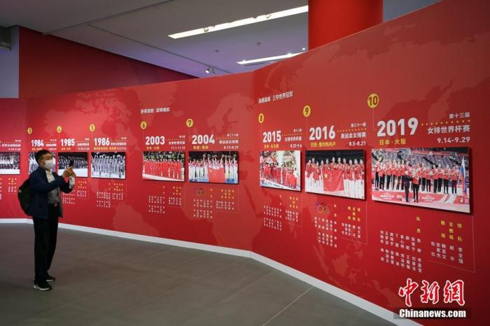 《国家荣誉—中国女排精神展》,一名观众用手机拍摄中国女排历史。中新社记者 佟郁 摄