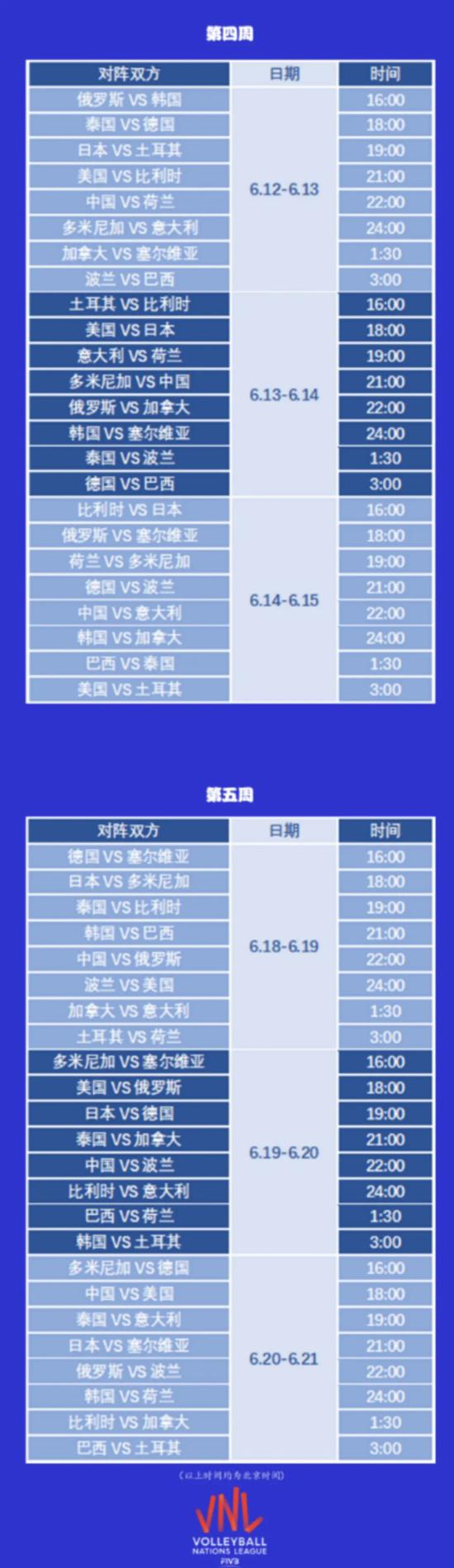 考虑到球迷观赛的时差问题,本次中国女排的比赛时间均安排在了合适中国球迷观看的时间段内。以下是中国女排的完整循环赛赛程: