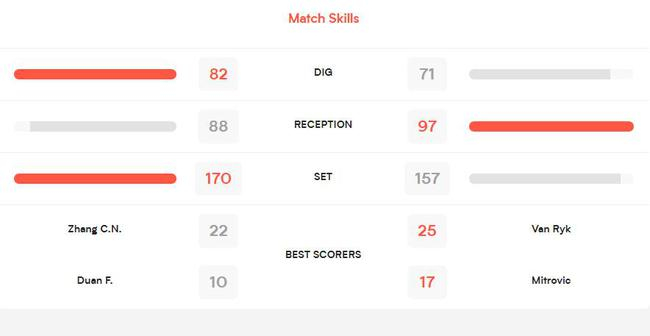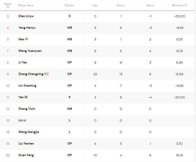队长张常宁得到22分,是队内得分王,但是她也出现13次失误,净得分9分。段放是另外一位得分上双的队员,拿到10分,18.18的效率值是全队最高。