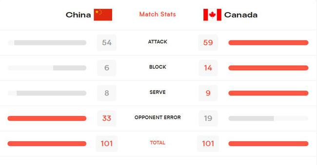 中国女排扣杀得分54-59加拿大,拦网6-14,发球得分8-9。对手失误送分33分,中国女排19次失误。总比分101平。