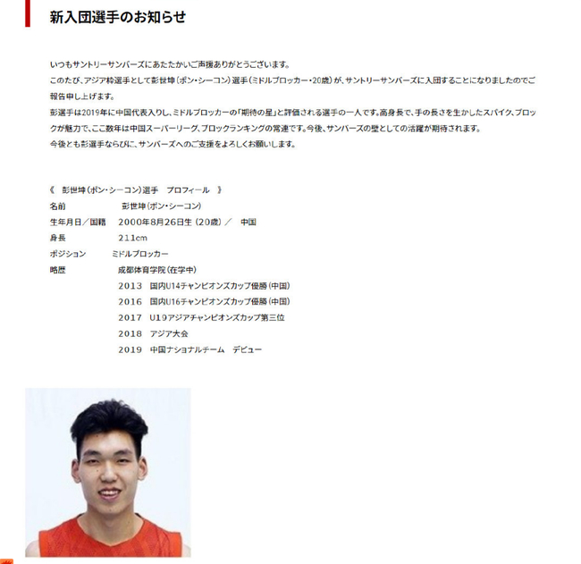 彭世坤下个月即将年满21岁,出生于四川德阳的他12岁才开始接触专业排球训练,之后顺利进入四川男排效力。目前彭世坤的身高已达2.11米,是中国男排的第一高度,司职副攻手的他在拦网环节拥有得天独厚的优势,近两年连续入选国家队阵容。日本男排联赛的外援政策是,每队只能有一名欧美外援,同时可以再有一名亚洲外援,因此多名中国男排高水平球员近几年也受到日本俱乐部的高度关注。