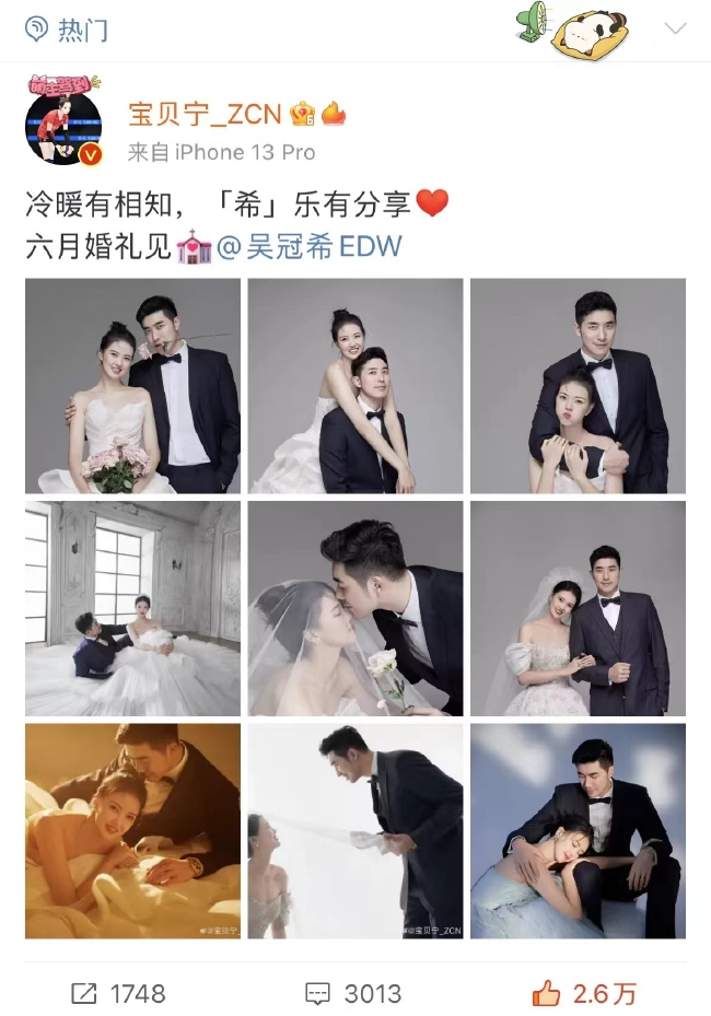 2月14日,女排奥运冠军张常宁和篮球明星运动员吴冠希同时在社交媒体上晒出婚纱照,并官宣了俩人将于今年6月份举办婚礼。
