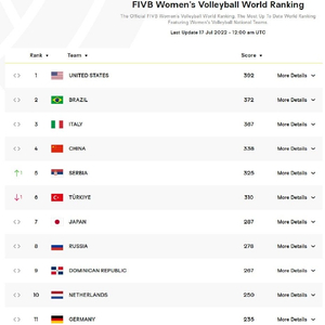 女排世界排名前10位的球队如下(注:截至UTC时间2022年7月17日12点):
