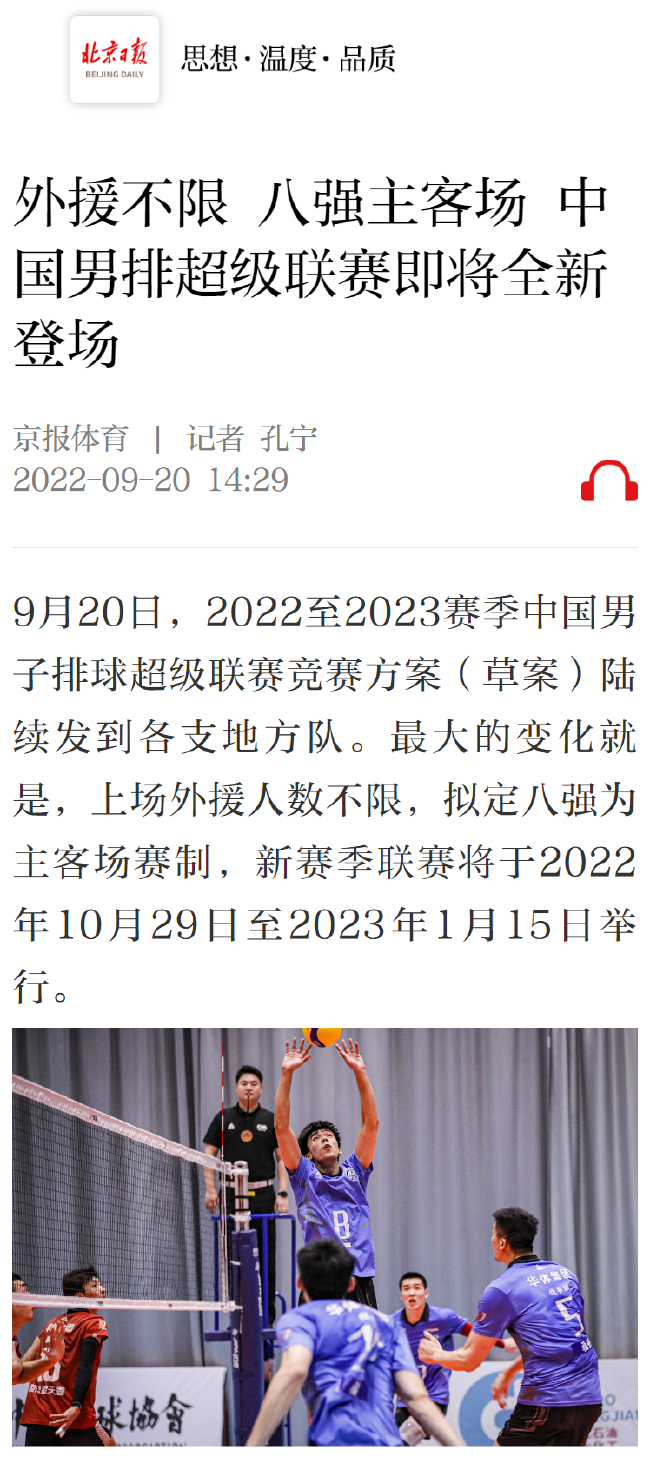 北京时间9月20日消息,据《北京日报》客户端京报体育报道,2022-2023赛季中国男子排球超级联赛将于2022年10月29日至2023年1月15日举行,新赛季男排超级联赛最大的变化是不再限制外援上场人数。