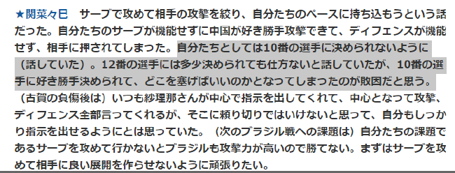 赛后,日本的主力二传关菜菜巳说:“我们的发球没能限制住对手,让中国可以随便进攻。防守也没起到作用,被对手所压制。我们私下议论的时候都说,就是被12号李盈莹扣中了也没办法,不能让对手的10号王云蕗拿分。但最终还是让10号也想怎么打怎么打,最后搞得我们不知道,是封堵哪里才好,这是最大的败因。”