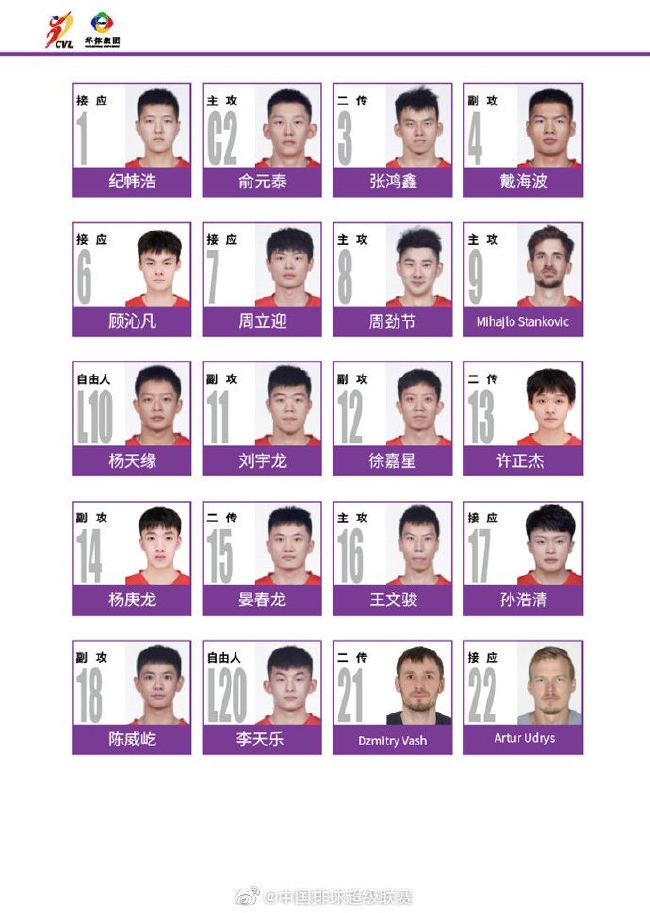 2022-2023赛季中国男子排球超级联赛B组7支球队大名单如下图所示: