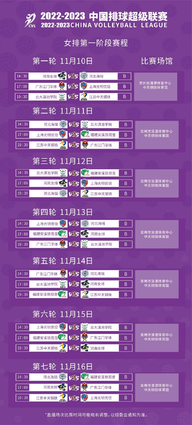 2022-2023赛季中国女子排球超级联赛第一阶段B组(常州赛区)竞赛日程如下图所示:
