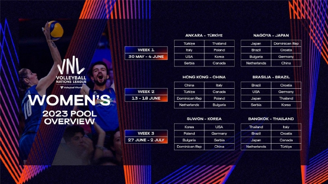 北京时间11月12日消息,国际排联公布了2023年国家女排联赛的赛程安排和分站赛承办地点。2023年国家排球联赛赛制与2022年一致,16支参赛队先进行三周分站赛角逐,之后举行总决赛。中国女排的三周分站赛都安排在亚洲进行,分别是日本名古屋、中国香港和韩国水原。分站赛的比赛时间为2023年5月30日至7月2日,总决赛时间为7月12日至16日。