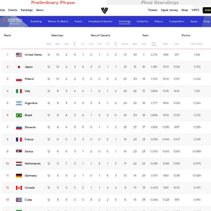 男排世联赛分站赛积分榜:美国居首 中国垫底降级
