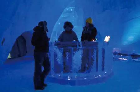 在科内斯冰酒店,人们睡在厚厚的保温床垫上,如果觉得不够温暖,还可以去睡袋里睡。灯光闪闪的冰雕是由来自“冰城”哈尔滨的艺术家雕刻的,如果有北极光,酒店会有专人叫醒你。双人间每人每晚377美元,包括三餐、桑拿和去科内斯市中心的班车费用。最近的机场就是科内斯机场。