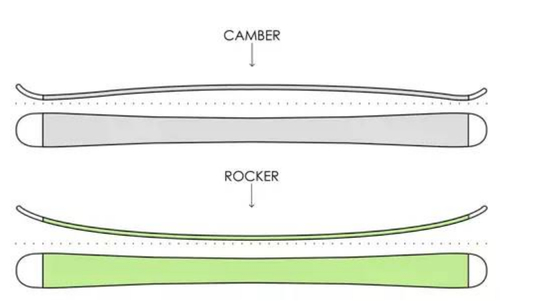 如果更进阶的话,还会注意到滑雪板有Camber和Rocker这种区别,这是因为板子的形状不同。