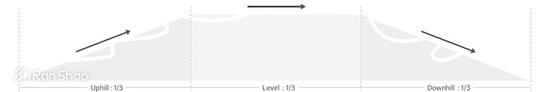 越野滑雪与高山滑雪最大的区别在于:高山滑雪时,整个脚掌都固定在雪板上,于是人不得不被限制在往下的斜坡上;而越野滑雪时,只有脚趾与雪板相连,脚跟是“自由”的,于是就可以翻山越岭,在各种变化的地形上奔驰。因此在越野滑雪比赛中,赛道分为上坡、下坡和平地三部分,每部分应各占全程的三分之一。