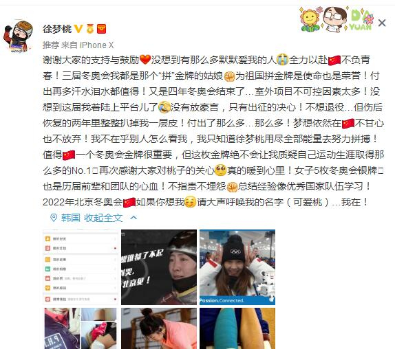 微博中配图表示自己与伤病抗争的过程,也展现了自己不放弃的坚强一面,同时这似乎暗示自己暂时不想退役,还要在家门口拼一次的决心,但在赛后采访时,徐梦桃也表示自己回国后要先手术,然后恢复恢复再做进一步的打算,不管最后桃子的决定如何,我们都会支持她!