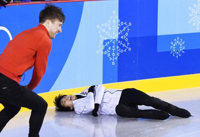 当天的排练在笑声中进行,羽生结弦还饶有兴趣地与其他选手一起模仿短道速滑选手的比赛,还惊险地摔向了挡板,但很快起身的他并没有什么大碍。