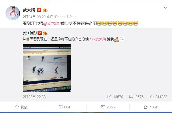 武大靖在2月22日获得平昌冬奥会短道速滑500冠军,这也是中国代表团在冬奥会的唯一一金,随后他公开自己的女神是江疏影,并在微博上表示自己被江疏影@十分开心,而昨晚的东方卫视年会,武大靖上台为江疏影颁奖,首次见到真人并送上第一次获得世界冠军时的头盔,还现场求签名,并收获了爱的抱抱。