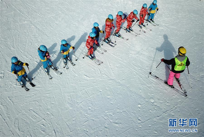 ↑1月3日,小学生在体验滑雪中。新华社记者范培珅摄
