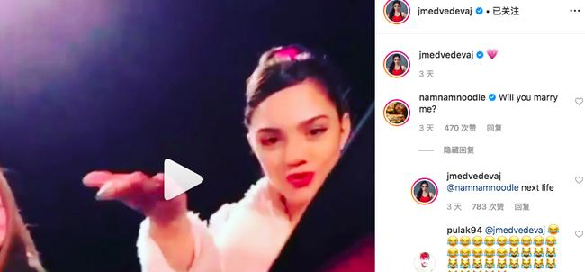 在ins上,阮南问梅娃:“你能嫁给我吗?”梅德韦杰娃回道:“下辈子吧。”(米修)