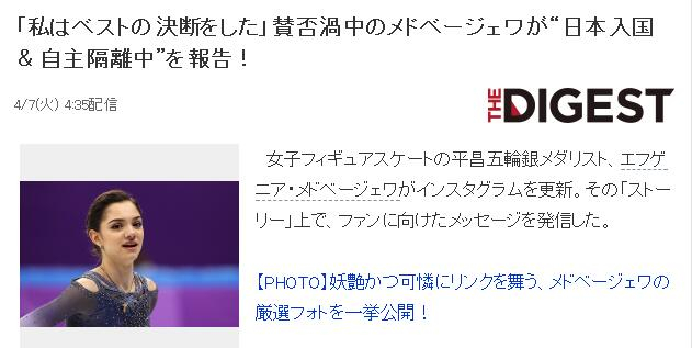 4月7日,据日本媒体《THE DIGEST》报道,2018年平昌冬奥会花样滑冰女单亚军、俄罗斯名将叶夫根尼娅-梅德韦杰娃更新社交媒体,讲述自己从加拿大前往日本后发生的故事。