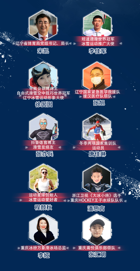值得一提的是,这次活动中,辽宁、重庆等地体育部门都进行了大力支持,连上主演播室所在的北京,这些地市相关省市体育部门负责人、冰雪领域从业者、运动医学专家、冰雪国家集训队运动员和大众冰雪运动爱好者等十位嘉宾,倾情参与到了直播当中。