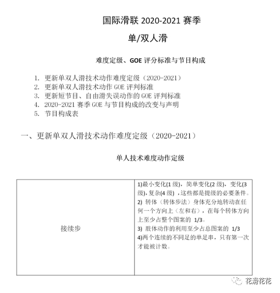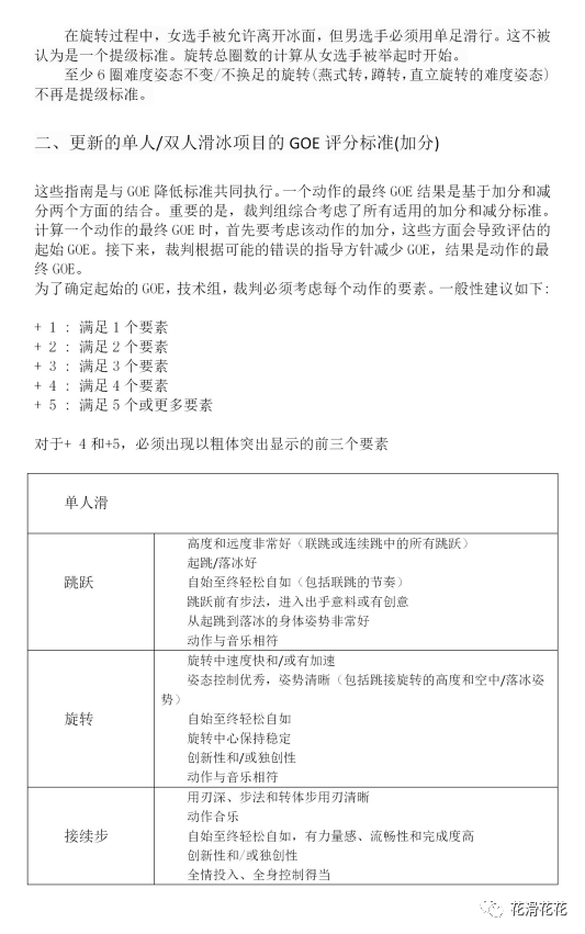 1。旋转增加难度滑出作为评判标准,但难度进入或难度滑出,只有其中一个将作为提级标准;Windmill不被认为是一个难度进入或滑出,但仍然是一个提级标准,即在同一只脚上非基本姿态的难度变化和位置的难度变化;Toe Arabian将被认为是一个由跳跃执行的换足,将在短节目和自由滑均作为提级标准。