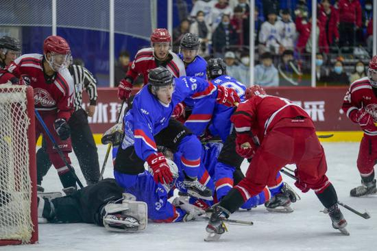 12月13日,双方球员在比赛中。当日,在云南腾冲举行的全国冰球锦标赛男子组决赛中,经过点球大战,北京体育职业学院队以3比2战胜哈尔滨队,获得本次比赛冠军。新华社记者江文耀摄