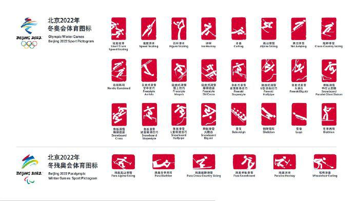 北京2022年冬奥会和冬残奥会的图标设计,以中国汉字为灵感来源,以篆刻艺术为主要呈现形式,将冬季运动元素与中国传统文化巧妙结合,彰显了北京冬奥会和冬残奥会的理念和愿景。图标以霞光红为底色,寓意着日出东方,代表着热情和希望。据体育图标设计团队主创设计师林存真介绍,此次发布的体育图标,和北京2008年奥运会会徽“中国印”的设计理念遥相呼应。两者均为印章风格篆刻形式,是北京这座“双奥之城”留给世界的独特文化印记!体育图标发布后,将广泛应用于北京2022年冬奥会和冬残奥会赛事景观、指示系统、门票以及电视转播、新闻宣传、市场开发等多个领域。