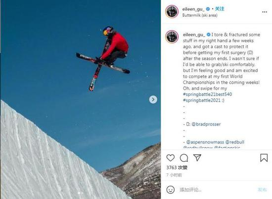 谷爱凌本月3日曾通过个人社交媒体透露,几周前她的右手骨折,先打了石膏保护,会在本赛季结束后进行手术。而接下来,她决定带伤走上世锦赛的赛场。